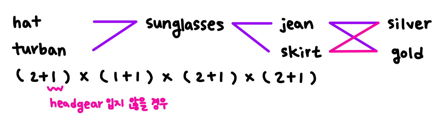 첫 번째 테스트 케이스는 headgear에 해당하는 의상이 hat, turban이며 eyewear에 해당하는 의상이 sunglasses이므로 (hat), (turban), (sunglasses), (hat,sunglasses), (turban,sunglasses)로 총 5가지 이다.