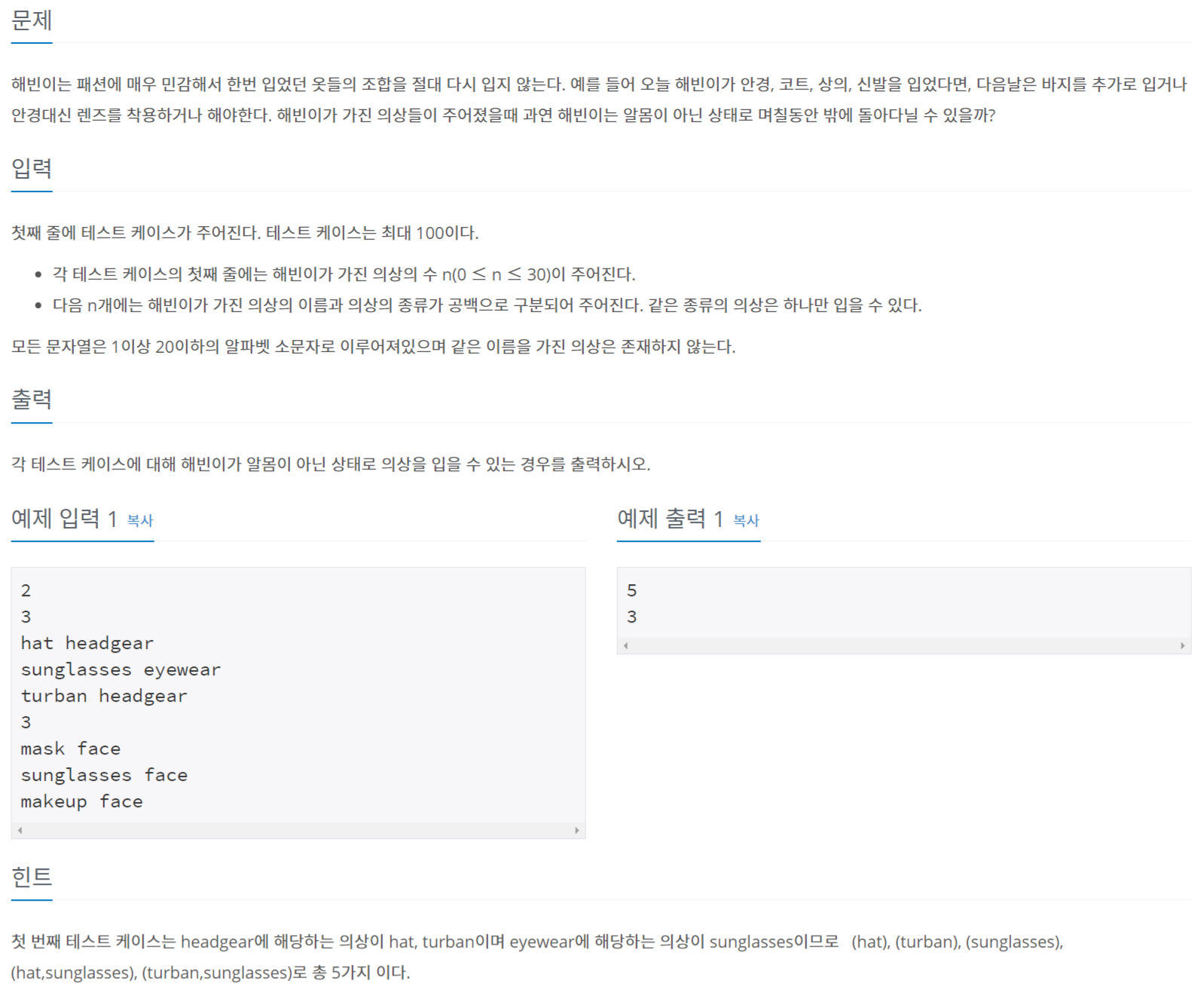 www.acmicpc.net/problem/9375 9375번: 패션왕 신해빈 첫 번째 테스트 케이스는 headgear에 해당하는 의상이 hat, turban이며 eyewear에 해당하는 의상이 sunglasses이므로 (hat), (turban), (sunglasses), (hat,s..