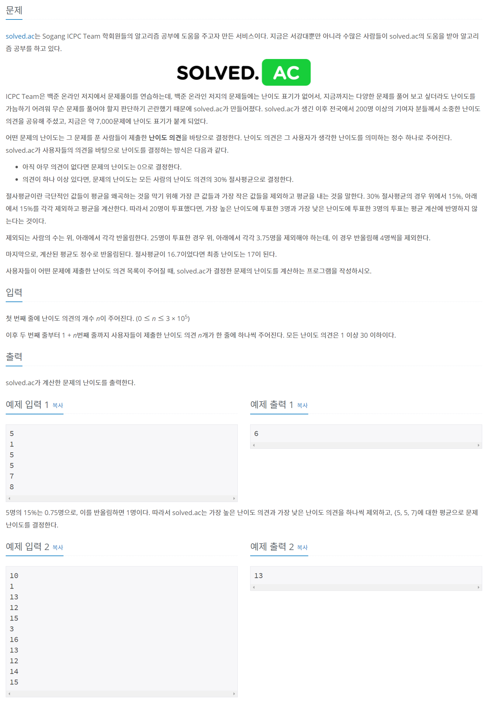5명의 15%는 0.75명으로, 이를 반올림하면 1명이다. 따라서 solved.ac는 가장 높은 난이도 의견과 가장 낮은 난이도 의견을 하나씩 제외하고, {5, 5, 7}에 대한 평균으로 문제 난이도를 결정한다.