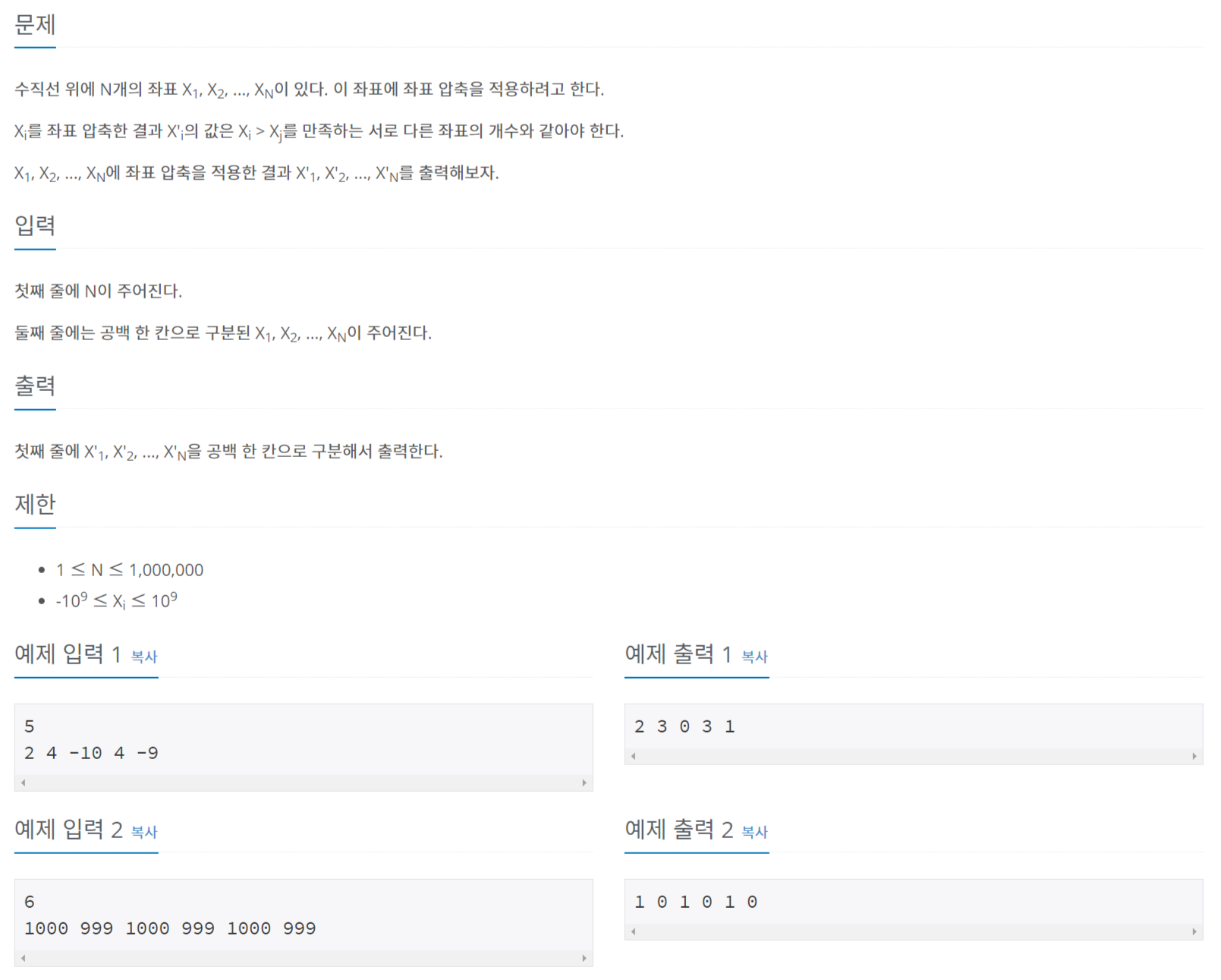 수직선 위에 N개의 좌표 X1, X2, ..., XN이 있다. 이 좌표에 좌표 압축을 적용하려고 한다. Xi를 좌표 압축한 결과 X'i의 값은 Xi > Xj를 만족하는 서로 다른 좌표의 개수와 같아야 한다. X1, X2, ..., XN에 좌