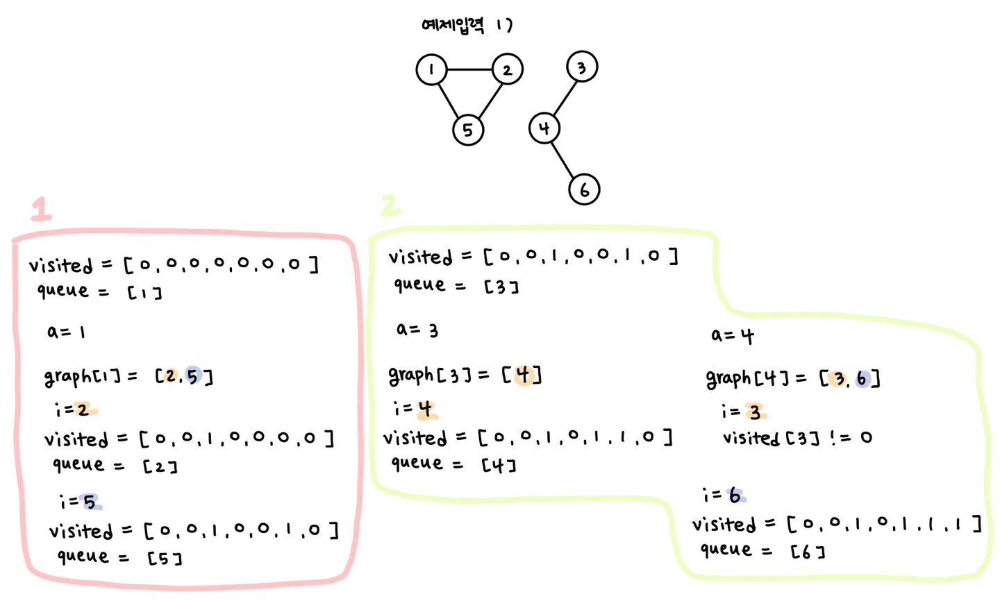 옆의 그림과 같이 예제 1은 2개의 연결 요소로 이루어져 있고,