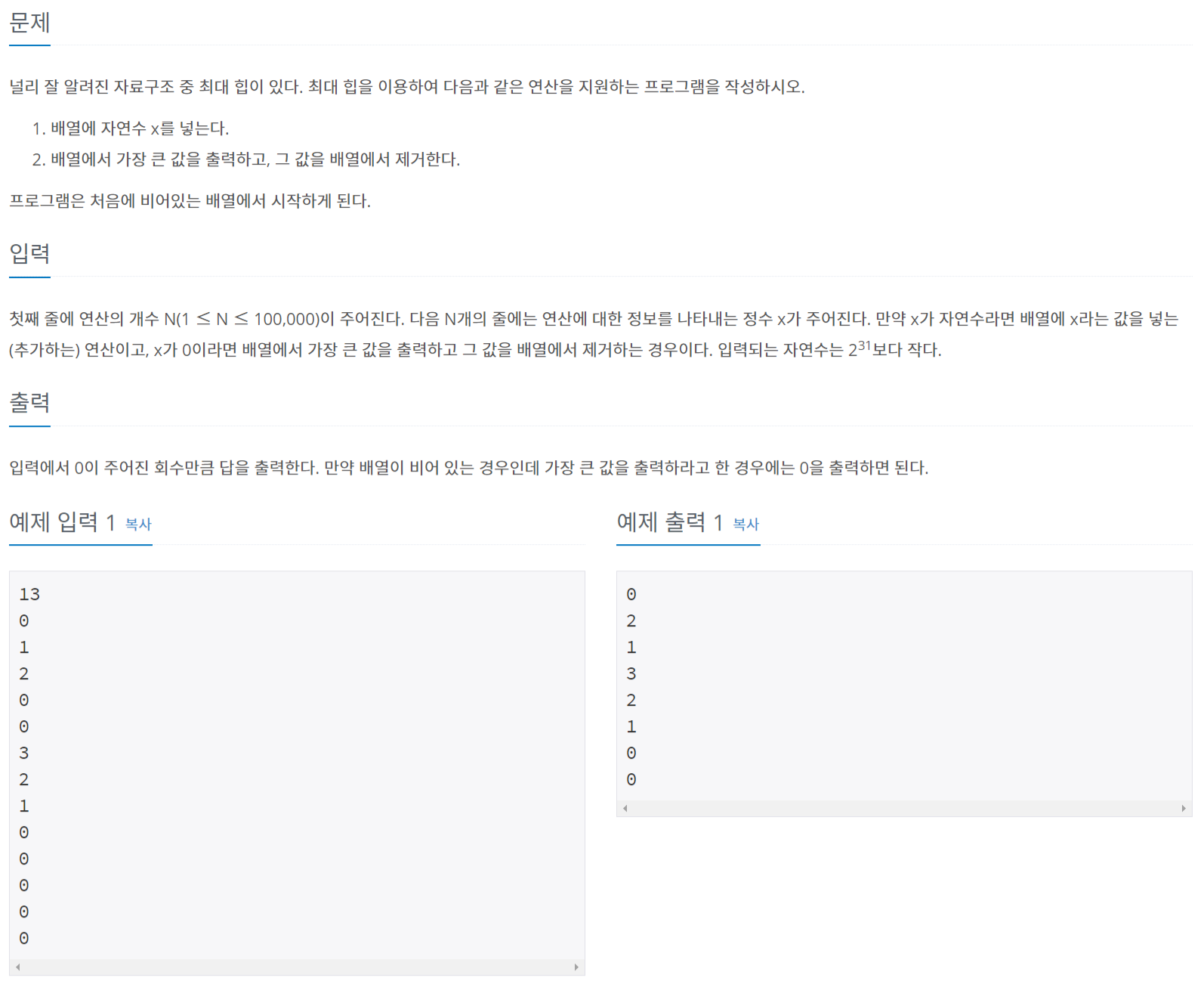 11279번: 최대 힙