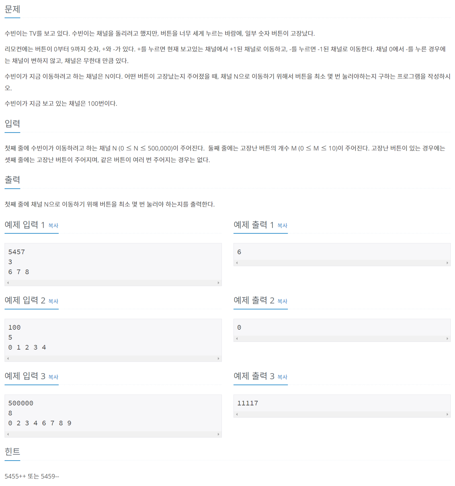 첫째 줄에 수빈이가 이동하려고 하는 채널 N (0 ≤ N ≤ 500,000)이 주어진다. 둘째 줄에는 고장난 버튼의 개수 M (0 ≤ M ≤ 10)이 주어진다. 고장난 버튼이 있는 경우에는 셋째 줄에는 고장난 버튼