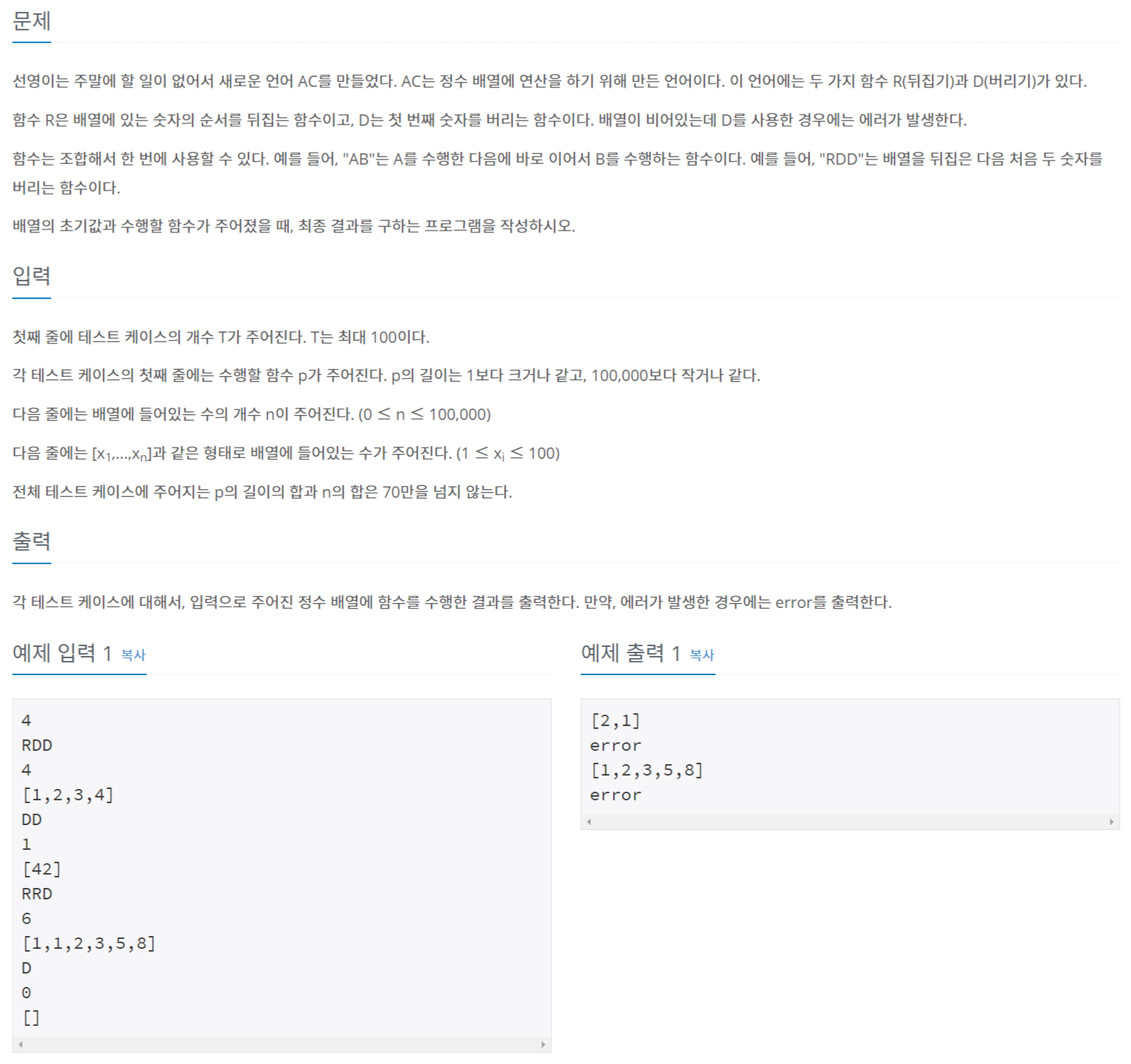 각 테스트 케이스에 대해서, 입력으로 주어진 정수 배열에 함수를 수행한 결과를 출력한다. 만약, 에러가 발생한 경우에는 error를 출력한다.