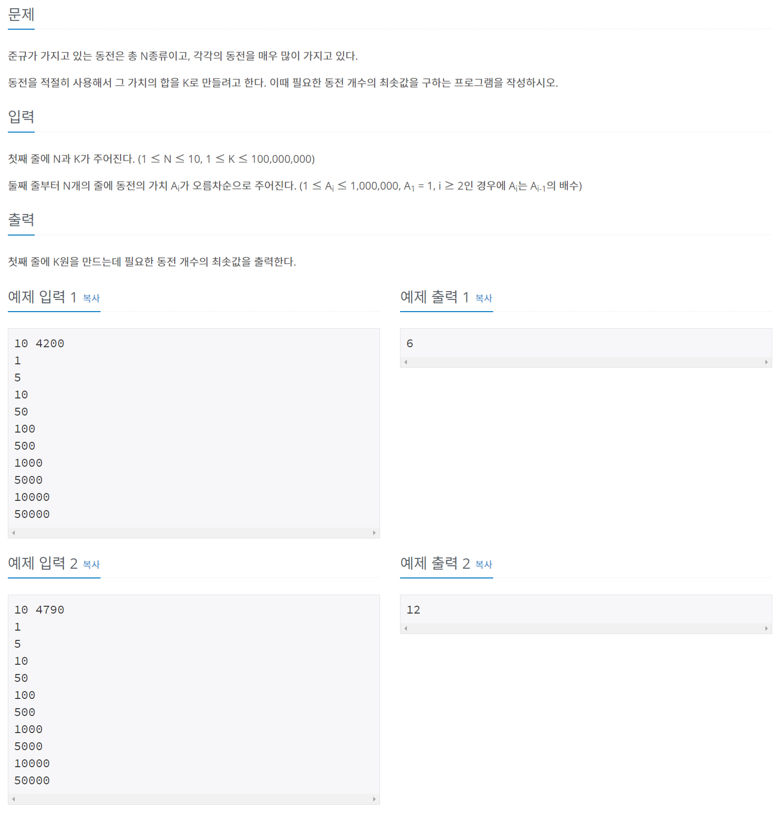 문제 조건이 큰 동전은 모두 작은 동전의 배수이기 때문에 이 문제는 그리디 알고리즘으로 풀 수 있다.