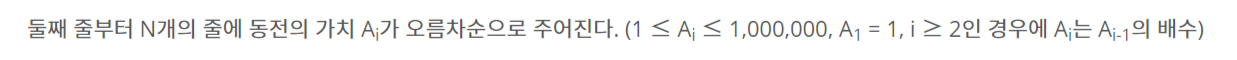 첫째 줄에 N과 K가 주어진다. (1 ≤ N ≤ 10, 1 ≤ K ≤ 100,000,000) 둘째 줄부터 N개의 줄에 동전의 가치 Ai가 오름차순으로 주어진다. (1 ≤ Ai ≤ 1,000,000, A1 = 1, i ≥ 2인 경우에 Ai는 Ai-1의 배수)