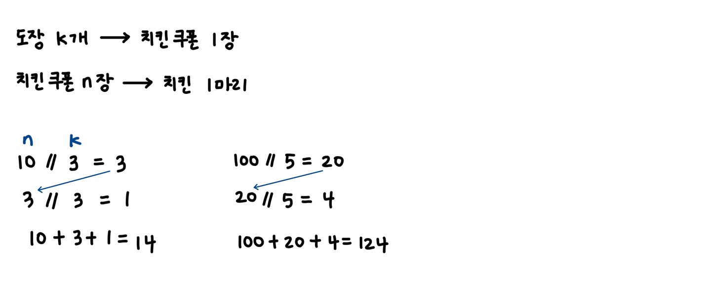 강민이는 치킨 한 마리를 주문할 수 있는 치킨 쿠폰을 n장 가지고 있다. 이 치킨집에서는 치킨을 한 마리 주문할 때마다 도장을 하나씩 찍어 주는데, 도장을 k개 모으면 치킨 쿠폰 한 장으로 교환