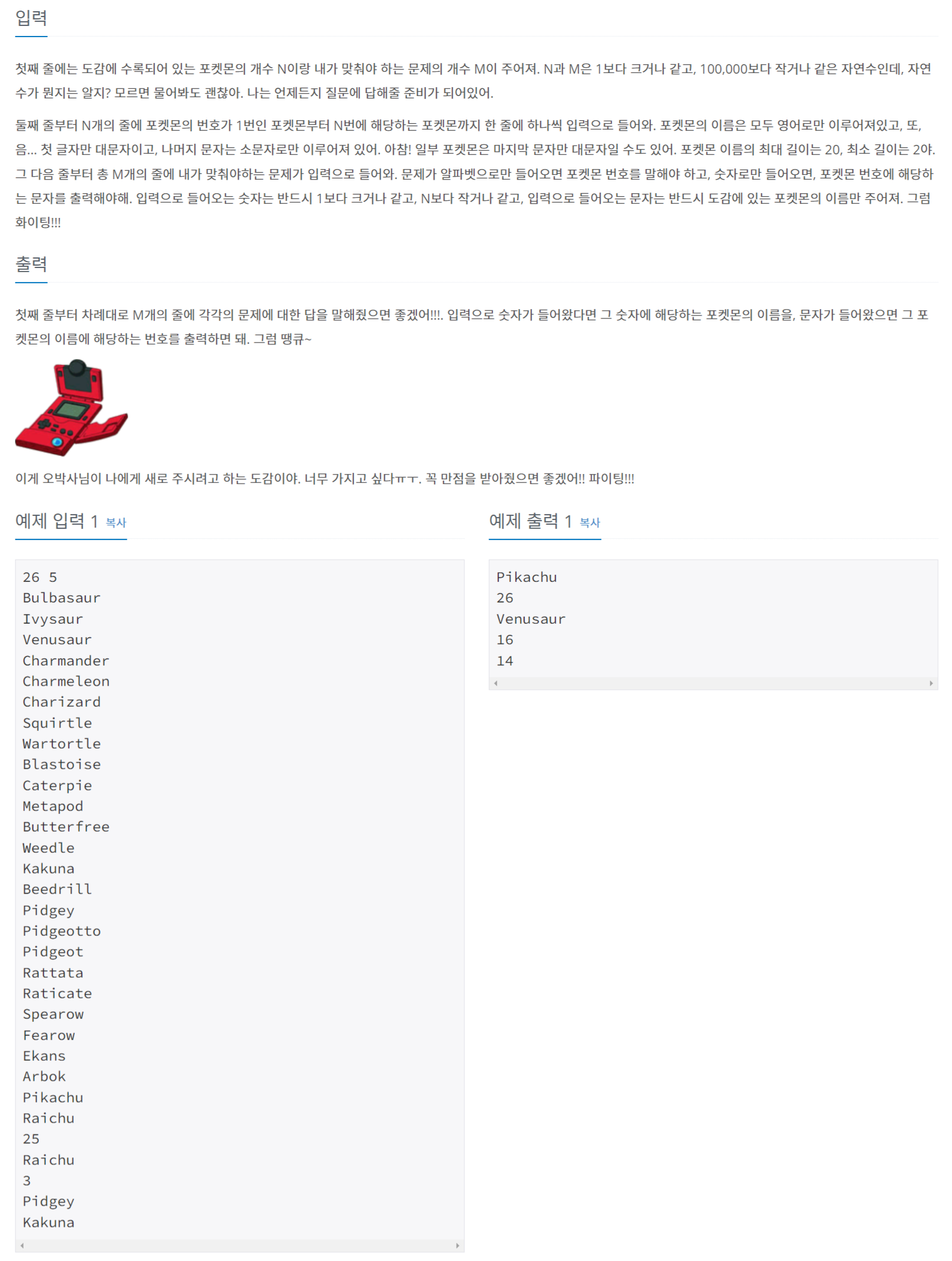 첫째 줄에는 도감에 수록되어 있는 포켓몬의 개수 N이랑 내가 맞춰야 하는 문제의 개수 M이 주어져. N과 M은 1보다 크거나 같고, 100,000보다 작거나 같은 자연수인데, 자연수가 뭔지는 알지? 모르면