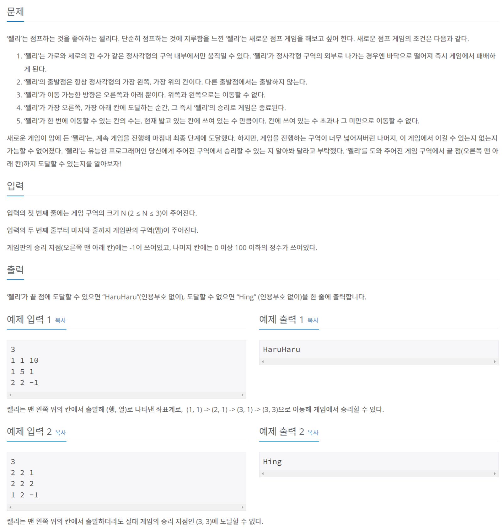 쩰리는 맨 왼쪽 위의 칸에서 출발해 (행, 열)로 나타낸 좌표계로, (1, 1) -> (2, 1) -> (3, 1) -> (3, 3)으로 이동해 게임에서 승리할 수 있다.