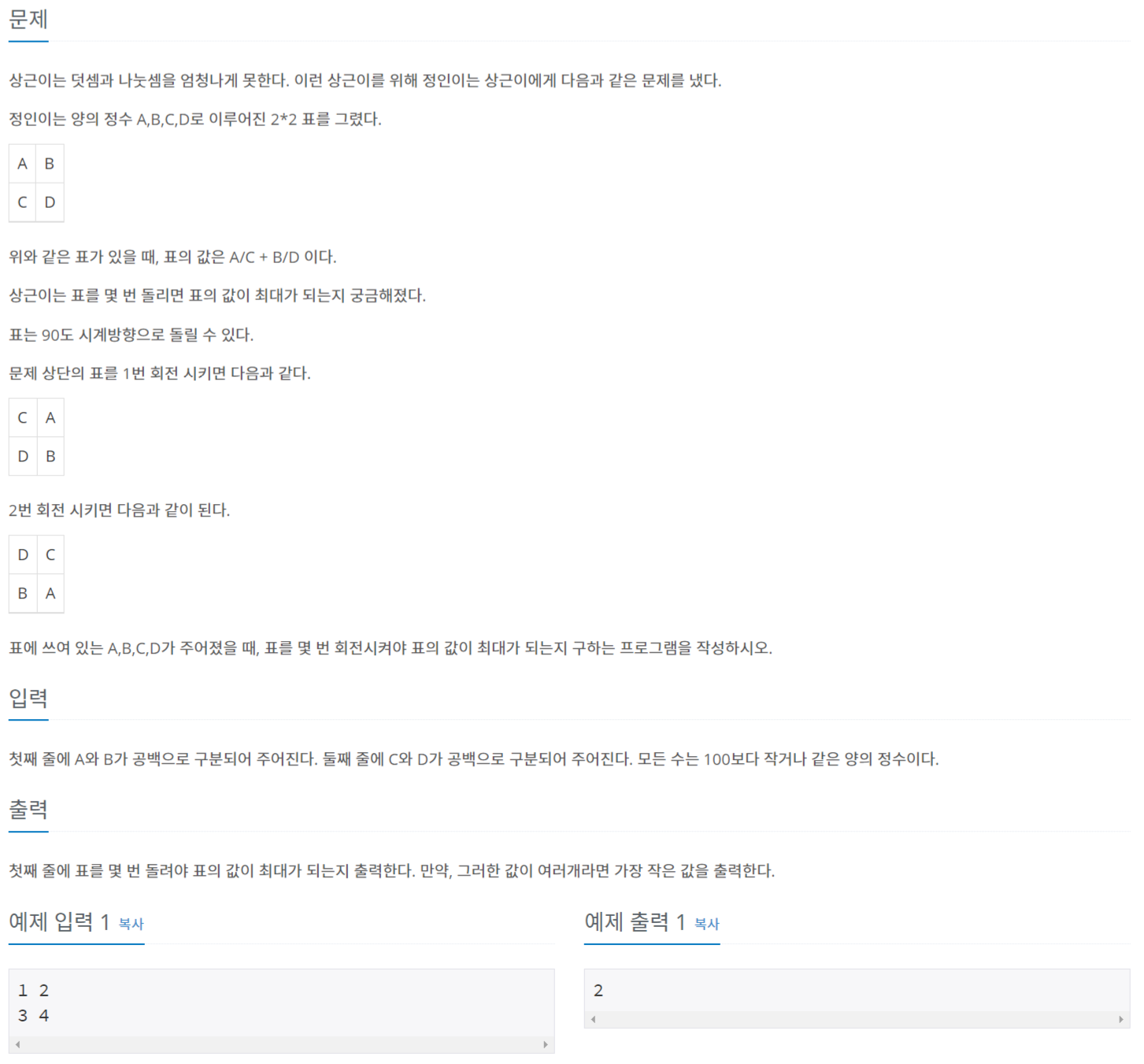 첫째 줄에 표를 몇 번 돌려야 표의 값이 최대가 되는지 출력한다. 만약, 그러한 값이 여러개라면 가장 작은 값을 출력한다.
