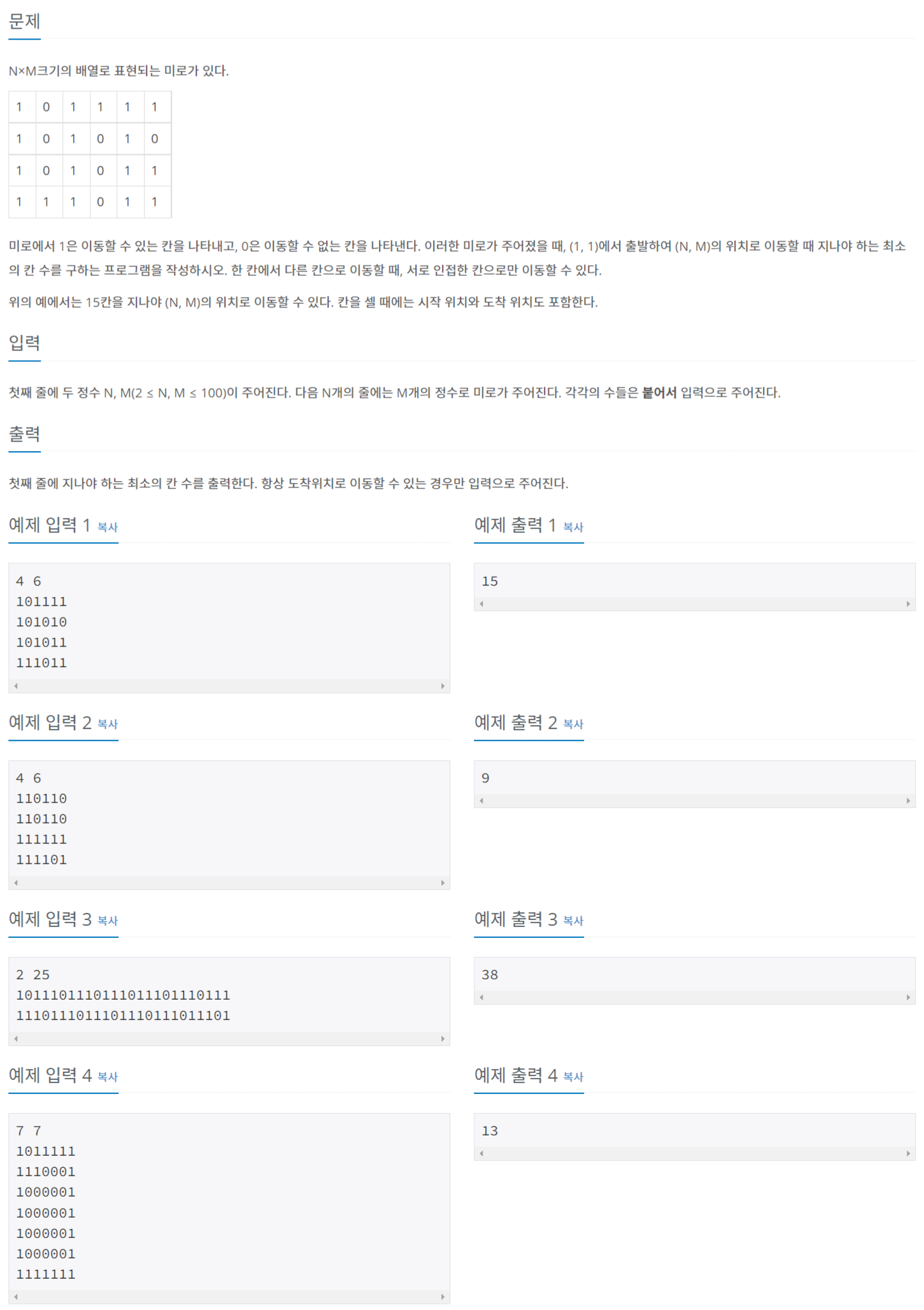 첫째 줄에 두 정수 N, M(2 ≤ N, M ≤ 100)이 주어진다. 다음 N개의 줄에는 M개의 정수로 미로가 주어진다. 각각의 수들은 붙어서 입력으로 주어진다.