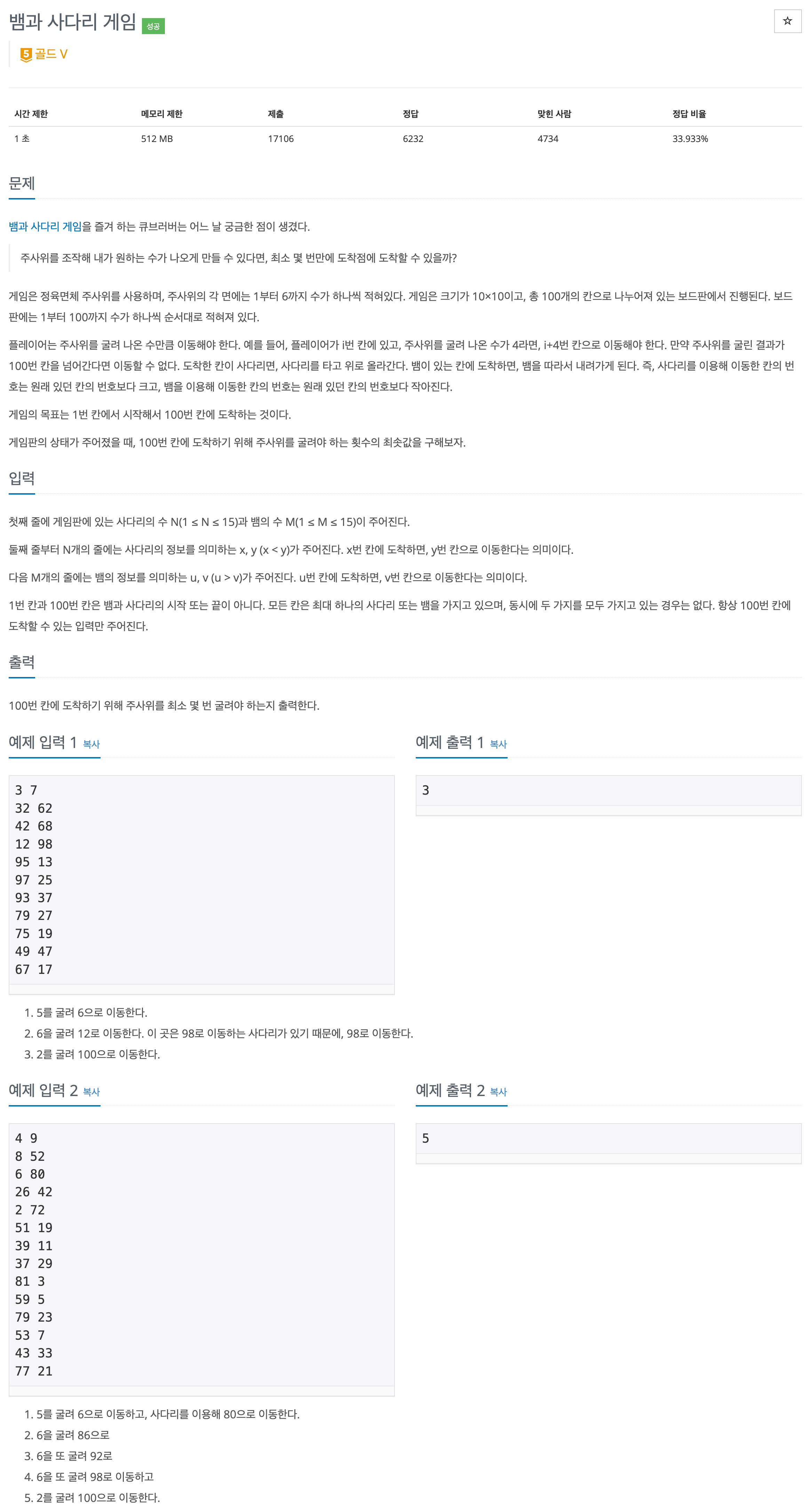 첫째 줄에 게임판에 있는 사다리의 수 N(1 ≤ N ≤ 15)과 뱀의 수 M(1 ≤ M ≤ 15)이 주어진다. 둘째 줄부터 N개의 줄에는 사다리의 정보를 의미하는 x, y (x < y)가 주어진다. x번 칸에 도착하면, y번 칸으