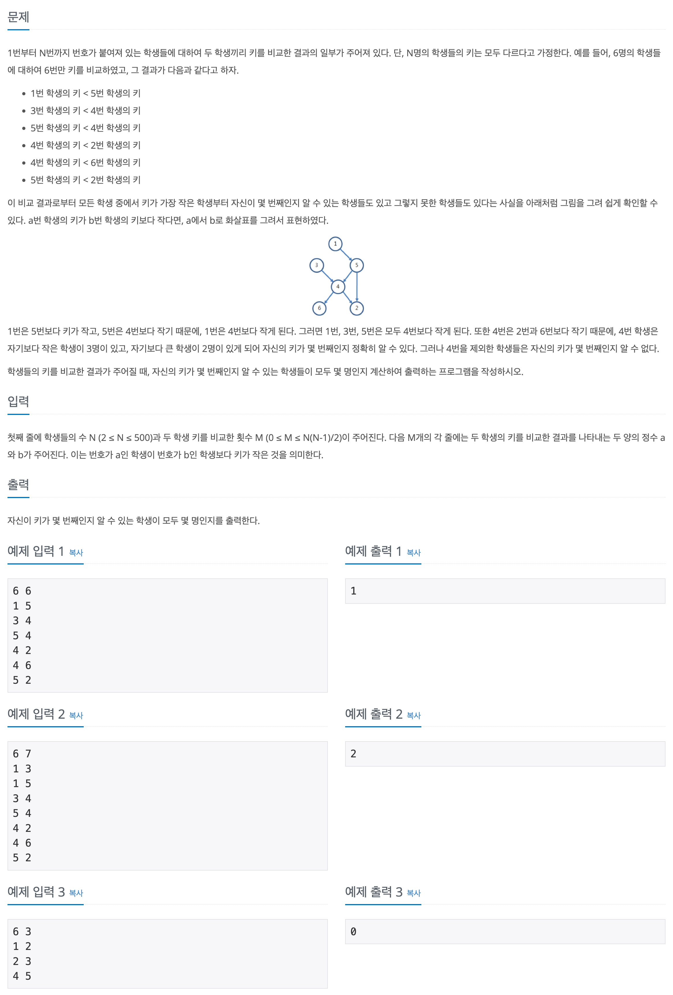 1번부터 N번까지 번호가 붙여져 있는 학생들에 대하여 두 학생끼리 키를 비교한 결과의 일부가 주어져 있다. 단, N명의 학생들의 키는 모두 다르다고 가정한다. 예를 들어, 6명의 학생들에 대하여
