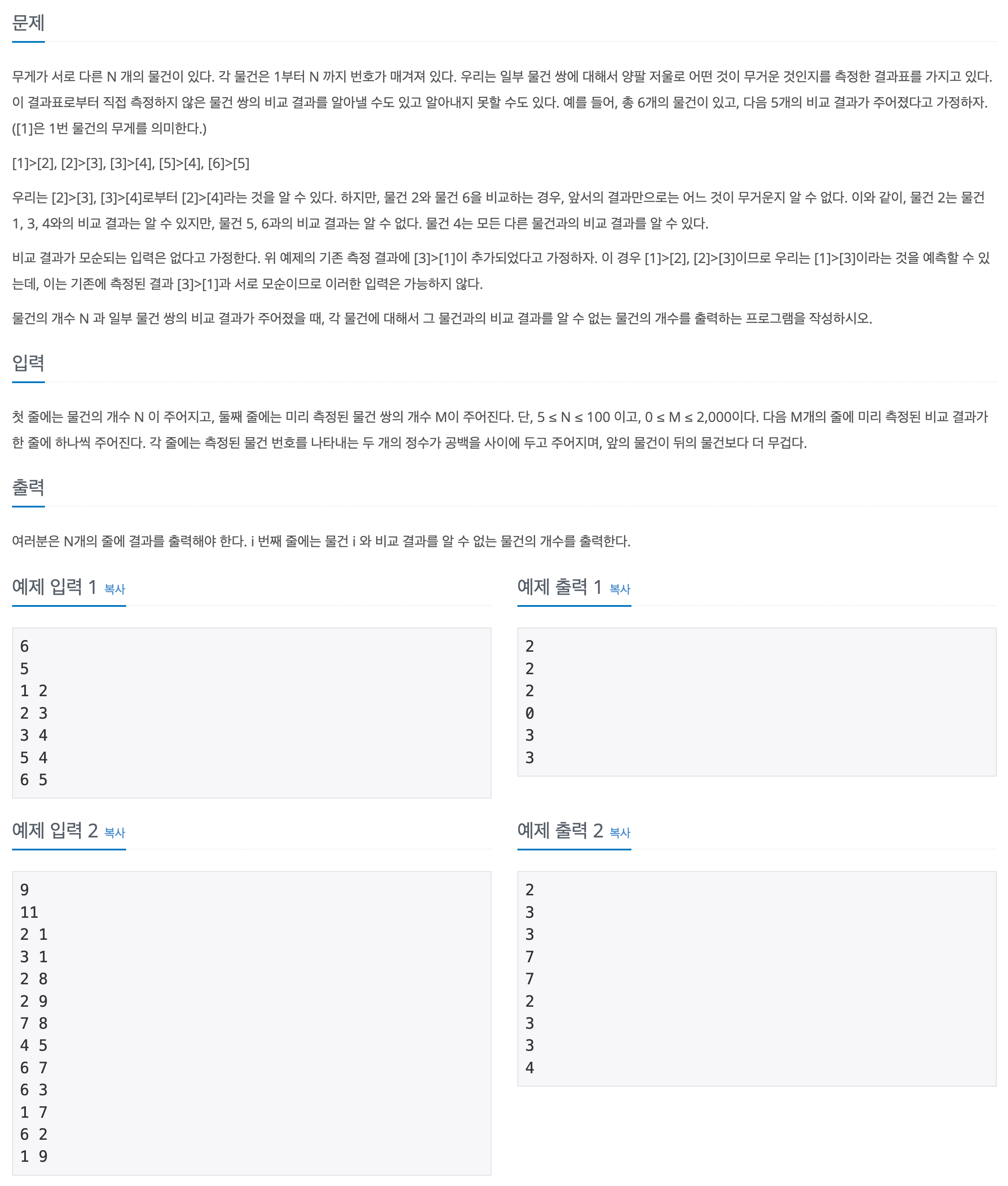첫 줄에는 물건의 개수 N 이 주어지고, 둘째 줄에는 미리 측정된 물건 쌍의 개수 M이 주어진다. 단, 5 ≤ N ≤ 100 이고, 0 ≤ M ≤ 2,000이다. 다음 M개의 줄에 미리 측정된 비교 결과가 한 줄에 하나씩