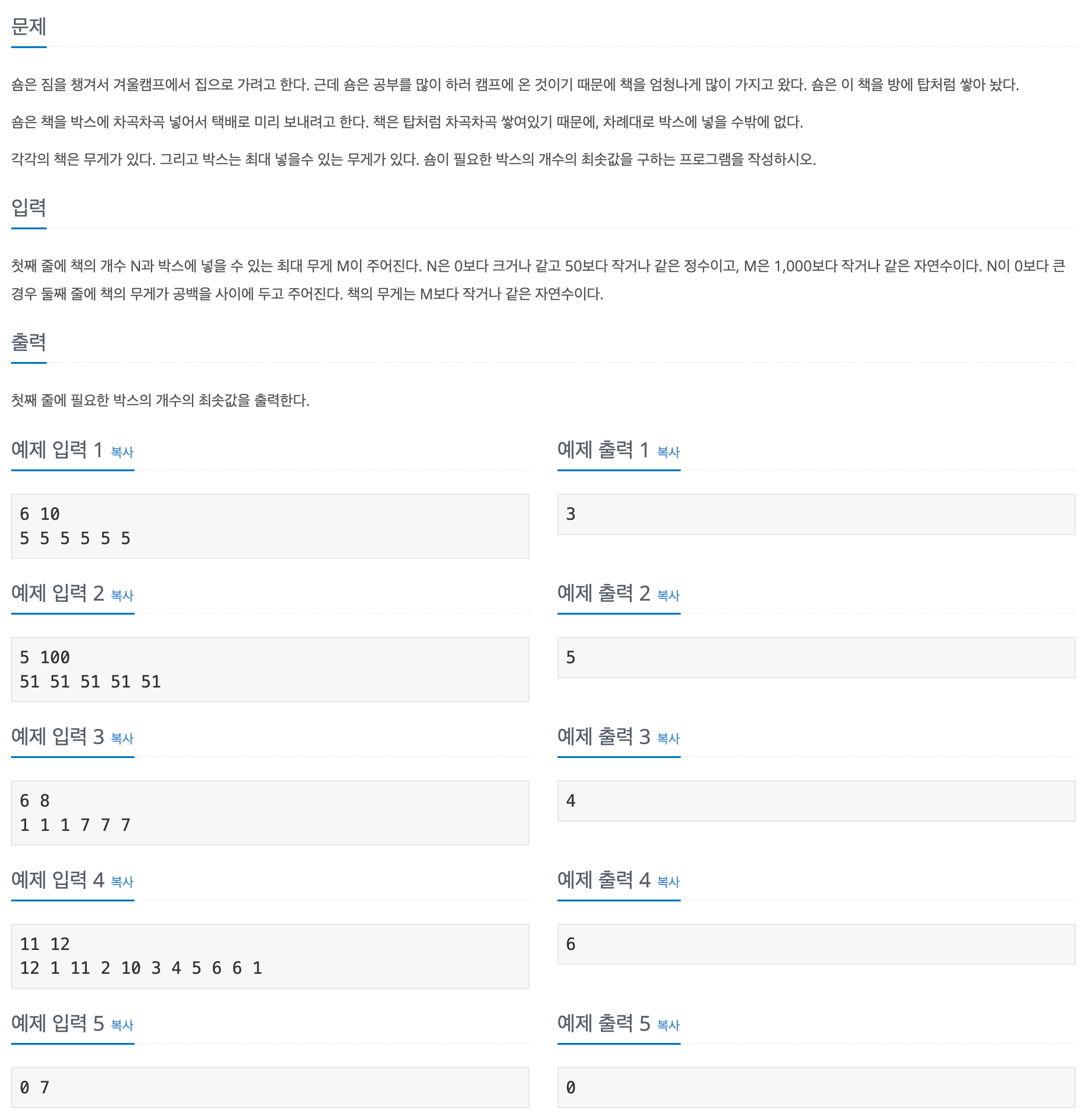 때문에 차례대로 반복문을 돌며 박스에 책을 넣었을 때 박스에 들어간 무게가 M을 넘는다면 박스 무게를 초기화 하여 현재 책의 무게를 담고 cnt를 1 증가시킨다.