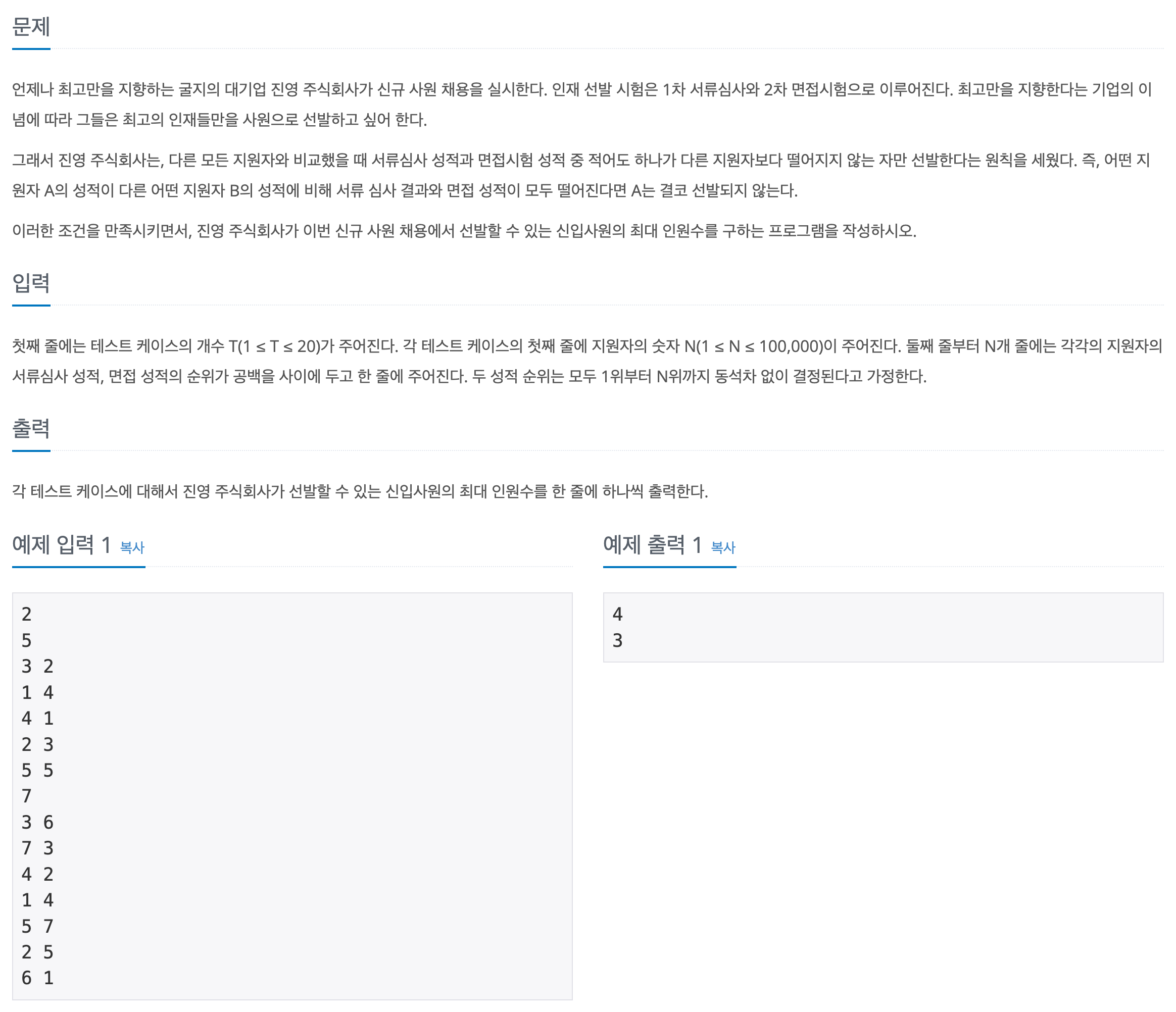 첫째 줄에는 테스트 케이스의 개수 T(1 ≤ T ≤ 20)가 주어진다. 각 테스트 케이스의 첫째 줄에 지원자의 숫자 N(1 ≤ N ≤ 100,000)이 주어진다. 둘째 줄부터 N개 줄에는 각각의 지원자의 서류심사 성