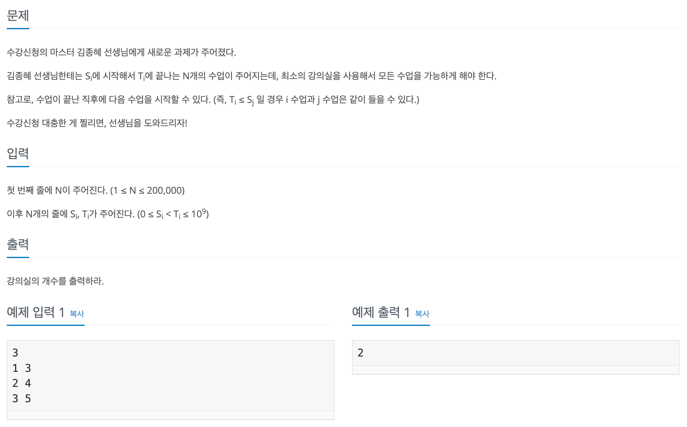 문제의 핵심은 현재 수업의 종료 시간이 다음 수업의 종료 시간보다 늦을 경우 회의실 하나를 더 배정해야 한다.