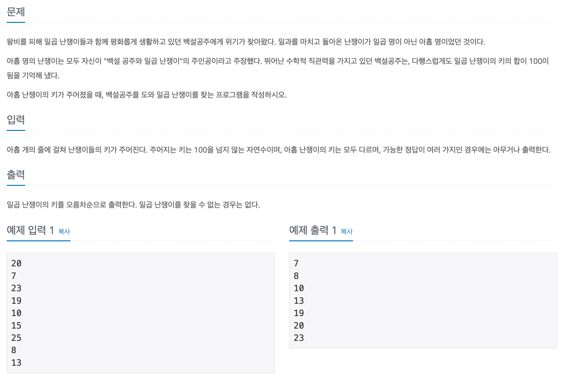 2309번: 일곱 난쟁이