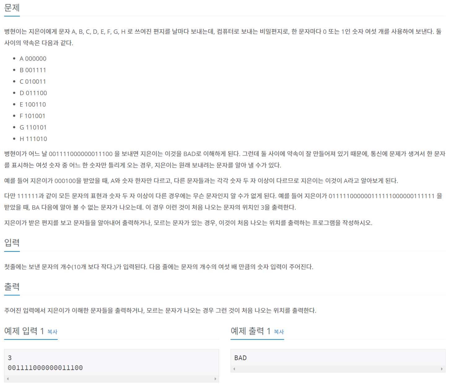 병현이는 지은이에게 문자 A, B, C, D, E, F, G, H 로 쓰여진 편지를 날마다 보내는데, 컴퓨터로 보내는 비밀편지로, 한 문자마다 0 또는 1인 숫자 여섯 개를 사용하여 보낸다. 둘 사이의 약속은 다음과