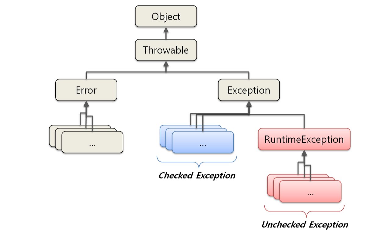 위의 자바 에러 클래스의 계층 구조를 보았을 때 RuntimeException의 하위 클래스들을 Unchecked Exception이라 하고 RuntimeException의 하위 클래스가 아닌 Exception 클래스의 하위 클래스들을 Checked Exception이라 한다.