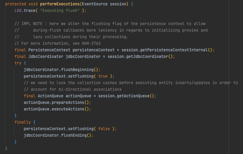 쓰기지연저장소에서 정렬한 sql문들은 엔티티를 flush 할 때 AbstractFlushingEventListener 클래스의 performExecutions 메서드에서 사용된다.