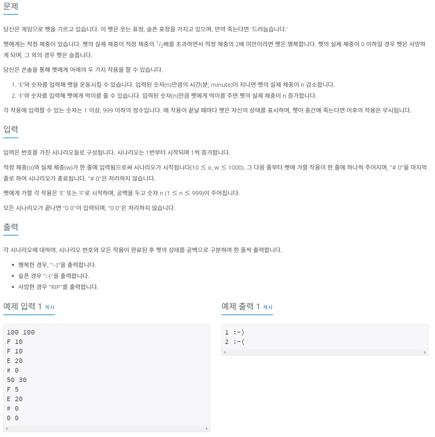 당신은 게임으로 펫을 기르고 있습니다. 이 펫은 웃는 표정, 슬픈 표정을 가지고 있으며, 만약 죽는다면 '드러눕습니다.' 펫에게는 적정 체중이 있습니다. 펫의 실제 체중이 적정 체중의 1/2배를