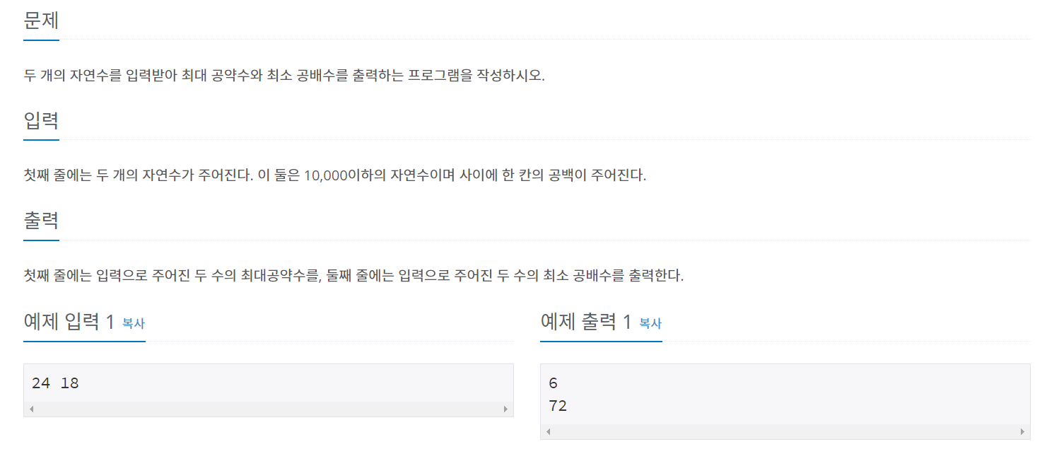 첫째 줄에는 입력으로 주어진 두 수의 최대공약수를, 둘째 줄에는 입력으로 주어진 두 수의 최소 공배수를 출력한다.