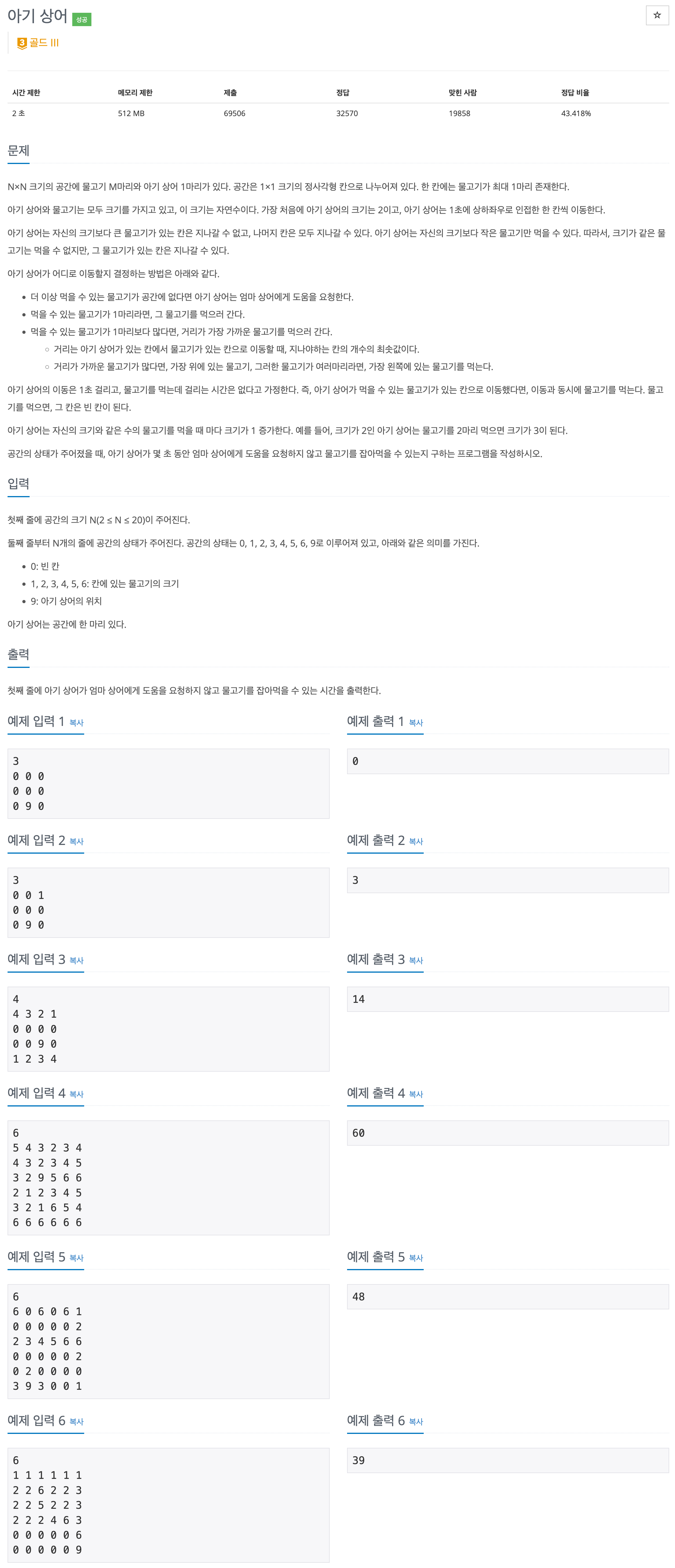 6. 자신의 크기와 같은 수의 물고기를 먹을 때 마다 아기 상어의 크기가 1 증가한다.