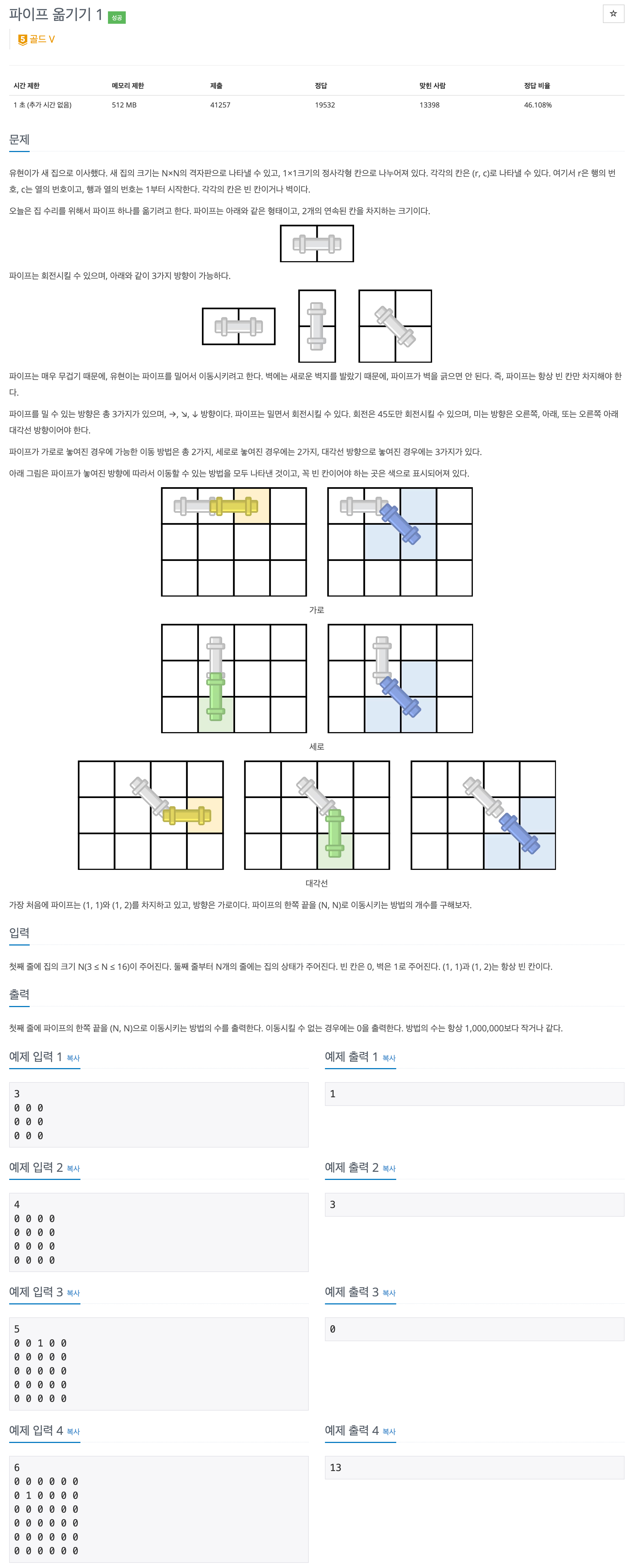 5. 파이프가 대각선일 경우, 가로로 한 칸 혹은 세로로 한 칸 혹은 대각선으로 한 칸 이동한다.