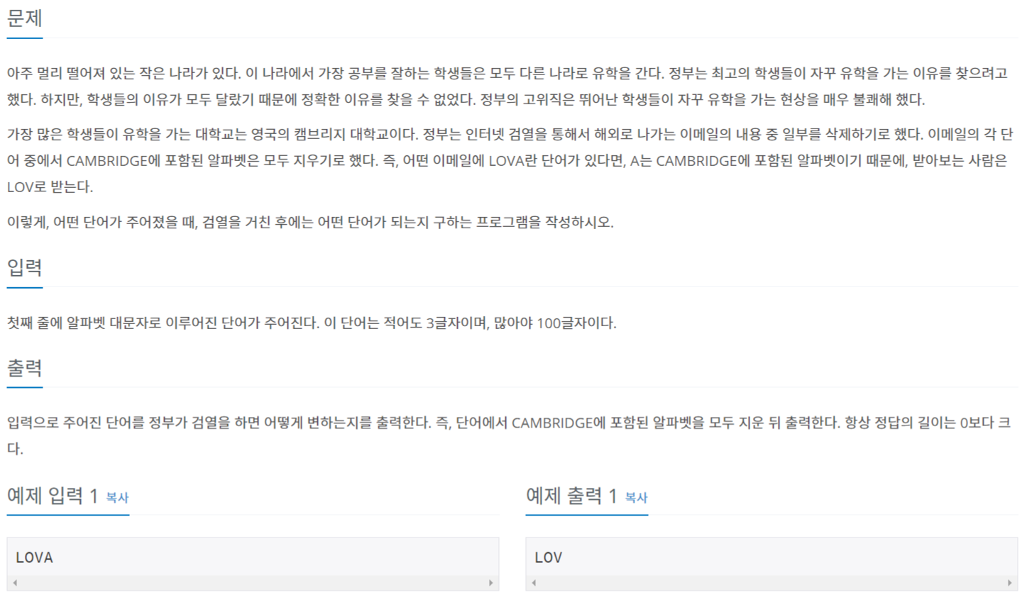 위 과정은 replace 함수를 쓰면 간단해지는데 "CAMBRIDGE"의 알파벳이 있을 경우 해당 알파벳을 ''로 replace 해 삭제할 수 있다. 코드길이는 훨씬 줄어들지만 시간은 첫 번째 코드가 더 빨리 걸린다. 이건.. 우연이겠지?..
