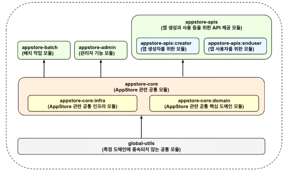 ex. api ์ ๊ณต: RestDocs ๋ฑ, admin: thymeleaf ๋ฑ, ๋ฐฐ์น ์์ : Spring Batch ๋ฑ- appstore-batch