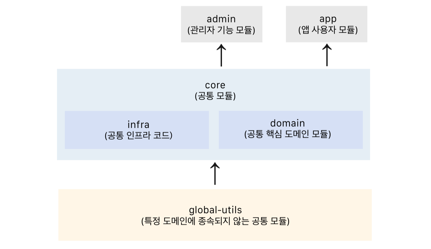 admin과 app 서버가 있고 공통으로 사용하는 코드들을 core 모듈에 모아놓은 구조이다.
