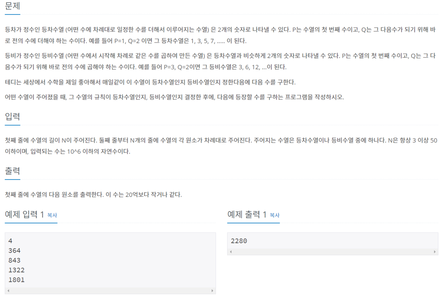수열의 원소들을 num 리스트에 담는다. 원소들은 항상 3 이상이기 때문에 num[2]까지 이전 인덱스 원소와 비교해 등차수열인지 등비수열인지 찾는다.