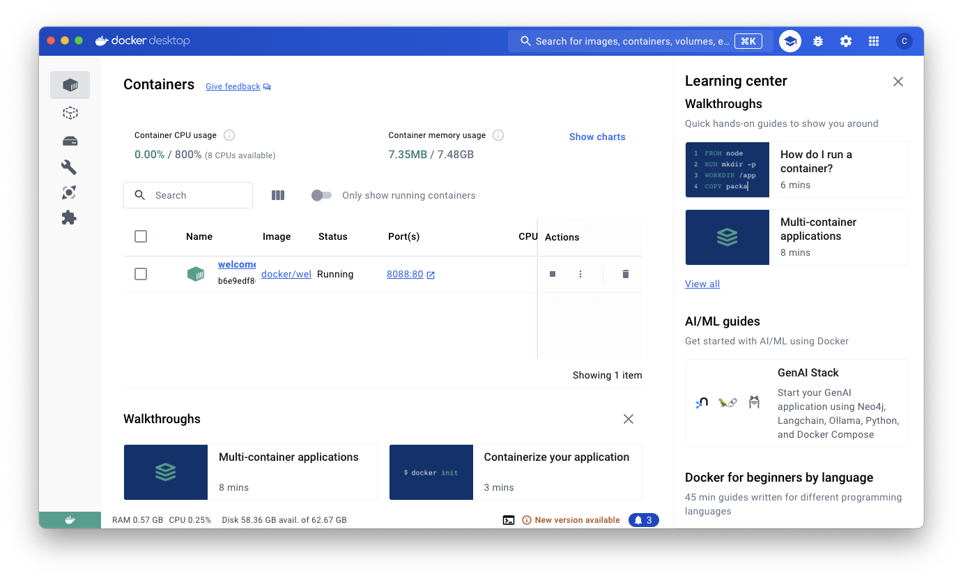 을 누르면 welcome-to-docker 컨테이너가 생기고 Containers 탭에서 이를 확인할 수 있다.