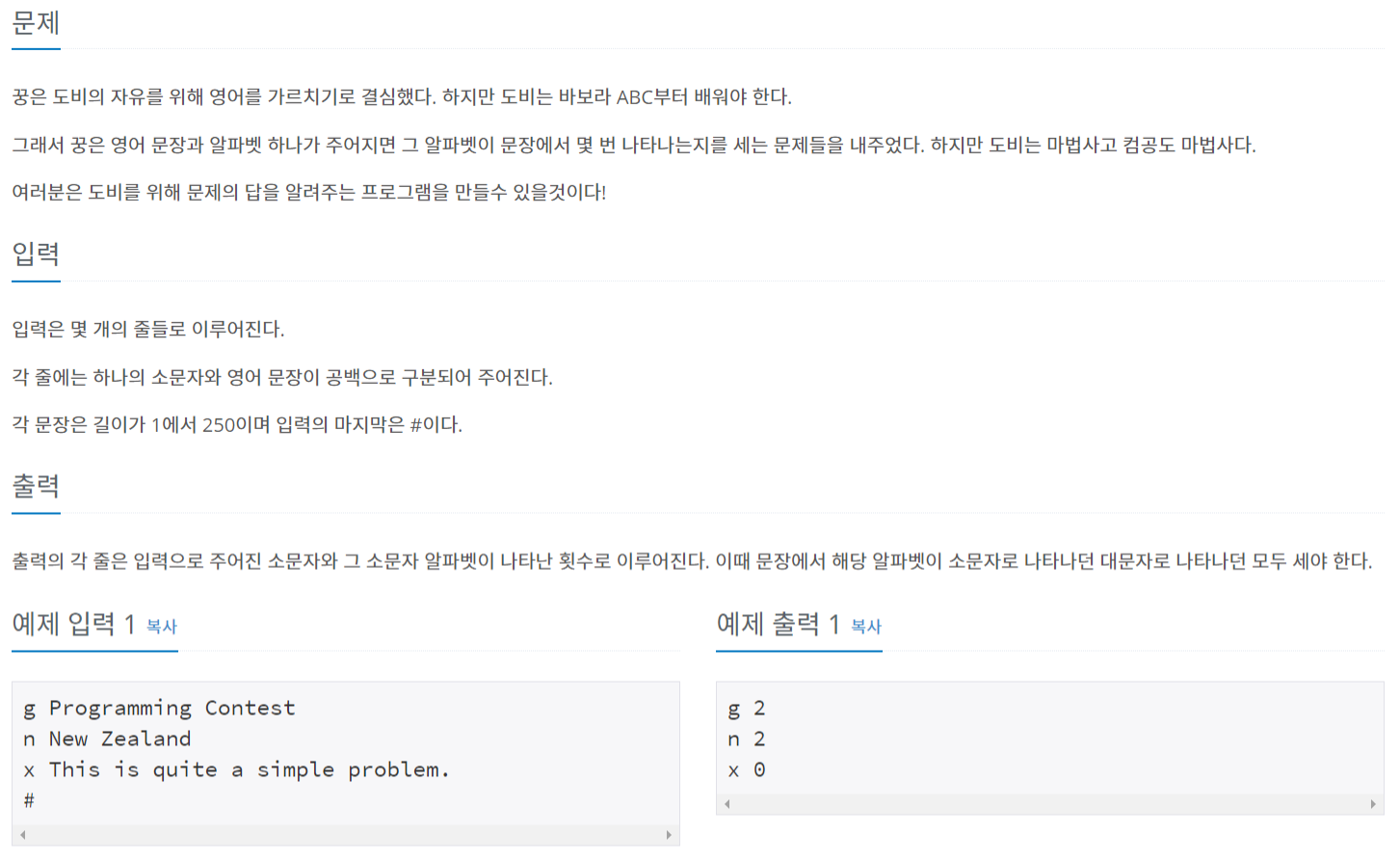 while문으로 입력을 받고 '#'이 입력되는 경우 while문을 탈출한다. 슬라이싱을 이용해 입력값을 알파벳과 문장으로 나누고 lower() 함수를 이용해 문장 전체를 소문자로 변환한다. 그 후 count함수를 사용해 해당 알파벳이 문장 안에 몇 번 나타나는지 구한다.