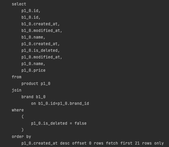 select p1_0.id,b1_0.id,b1_0.created_at,b1_0.modified_at,b1_0.name,p1_0.created_at,p1_0.is_deleted,p1_0.modified_at,p1_0.name,p1_0.price from product p1_0 join brand b1_0 on b1_0.id=p1_0.brand_id where (p1_0.is_deleted = false) order by p1_0.created_at desc offset 0 rows fetch first 21 rows only;
