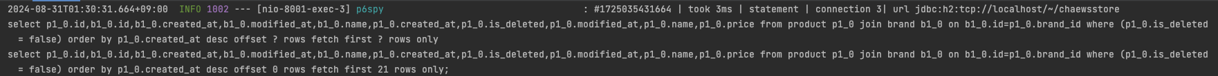 P6Spy를 설정한 후 테스트해보면, SQL 쿼리에서 ? 대신 실제 인자값이 표시되며, 쿼리가 한 줄로 출력되는 것을 확인할 수 있다.