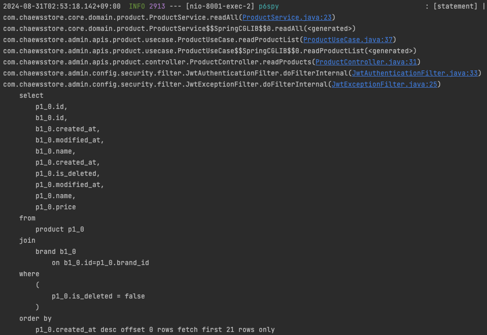 - P6Spy의 로그 메세지 포맷을 현재 클래스 이름인 P6SpyConfig로 설정해 로그 메세지를 해당 클래스의 포맷 방식으로 출력한다.