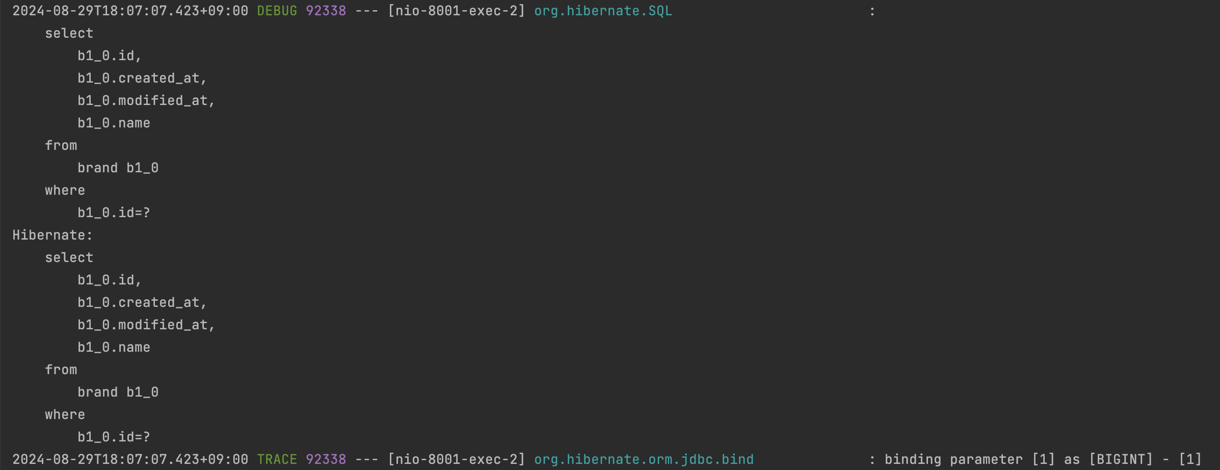 이전 글에서 application.yml의 logging 설정을 통해 SQL 쿼리에 바인딩되는 파라미터 값을 확인할 수 있었다.