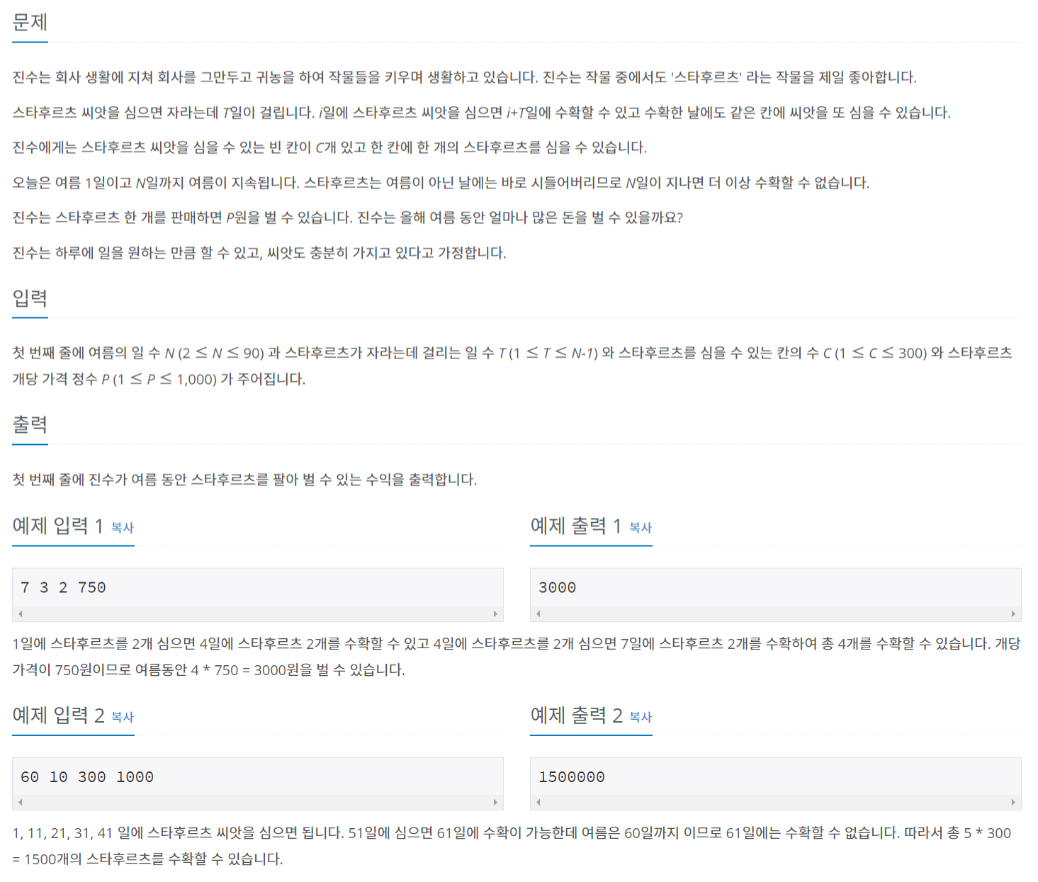 1, 11, 21, 31, 41 일에 스타후르츠 씨앗을 심으면 됩니다. 51일에 심으면 61일에 수확이 가능한데 여름은 60일까지 이므로 61일에는 수확할 수 없습니다. 따라서 총 5 * 300 = 1500개의 스타후르츠를 수확