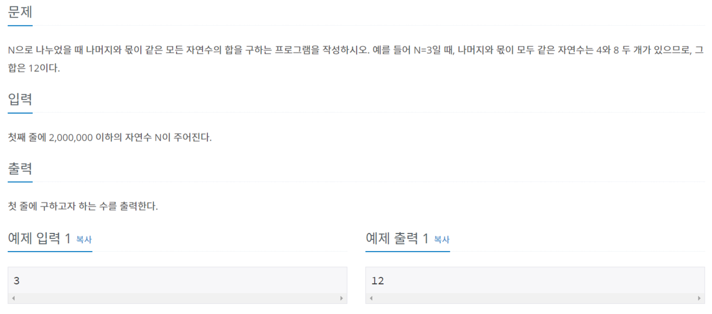 N으로 나누었을 때 나머지와 몫이 같은 모든 자연수의 합을 구하는 프로그램을 작성하시오. 예를 들어 N=3일 때, 나머지와 몫이 모두 같은 자연수는 4와 8 두 개가 있으므로, 그 합은 12이다.