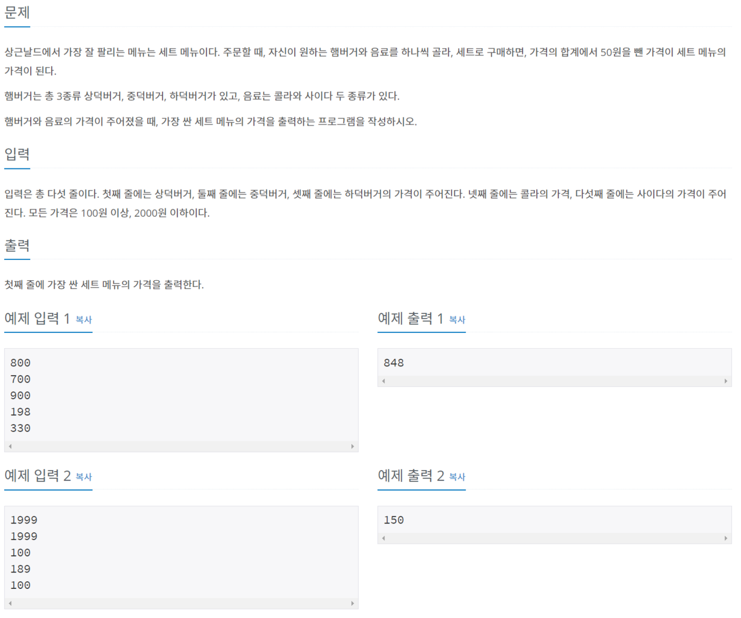 burger 리스트 중 가장 작은 값을 min(burger)로 구하고, drink 리스트 중 가장 작은 값을 min(drink)로 구해 더한 후 50을 빼주면 세트 가격 중 가장 작을 때의 값이 나온다.