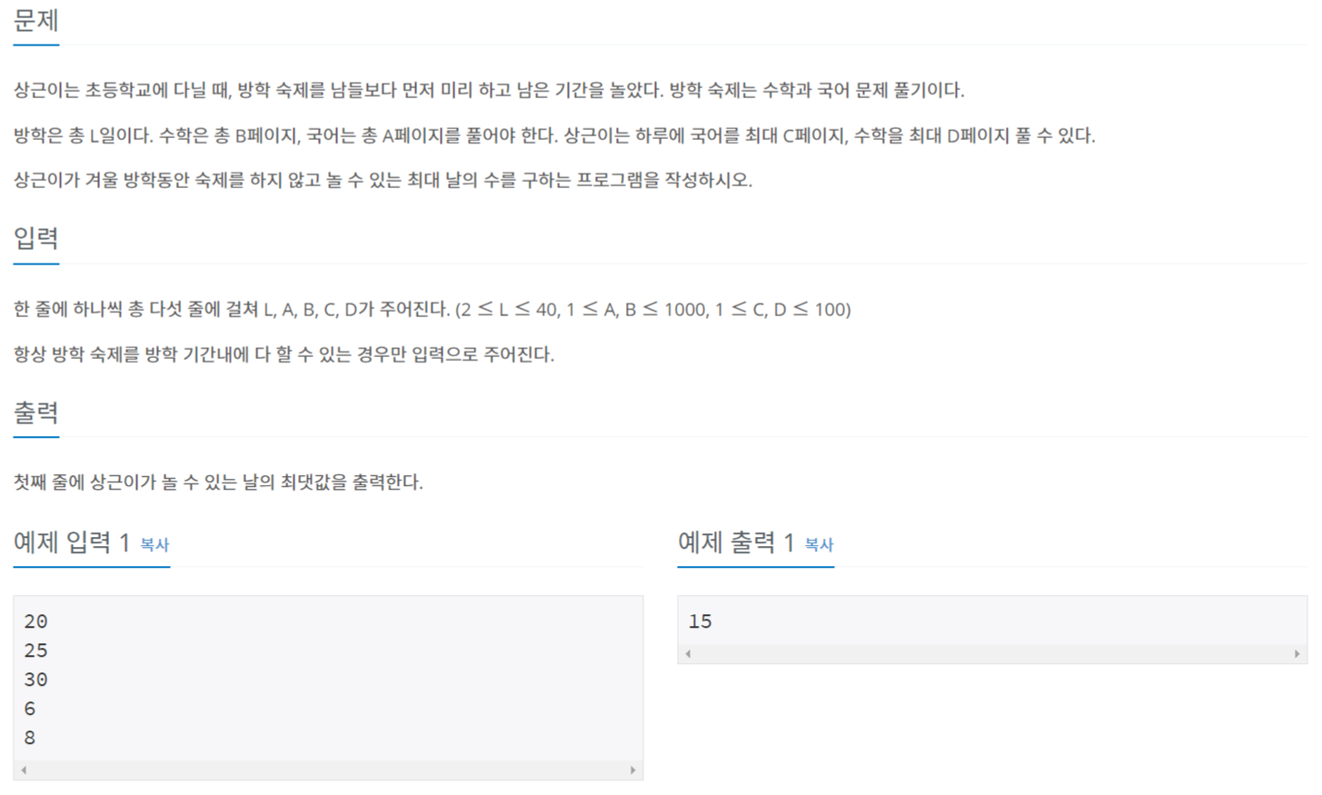 한 줄에 하나씩 총 다섯 줄에 걸쳐 L, A, B, C, D가 주어진다. (2 ≤ L ≤ 40, 1 ≤ A, B ≤ 1000, 1 ≤ C, D ≤ 100) 항상 방학 숙제를 방학 기간내에 다 할 수 있는 경우만 입력으로 주어진다.