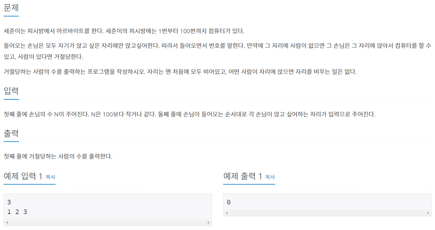 피시방 자리 100개를 다 0으로 초기화한 후 입력받은 자리를 인덱스로 이용해 해당 인덱스의 값이 0이면 1을 더하고 0이 아니면 이미 다른 손님이 앉아있기 때문에 refused_cnt를 1 증가시킨다.