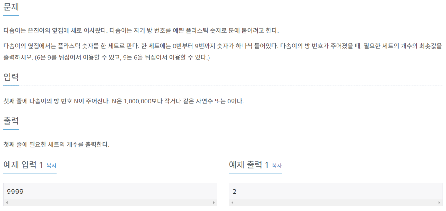 첫째 줄에 다솜이의 방 번호 N이 주어진다. N은 1,000,000보다 작거나 같은 자연수 또는 0이다.