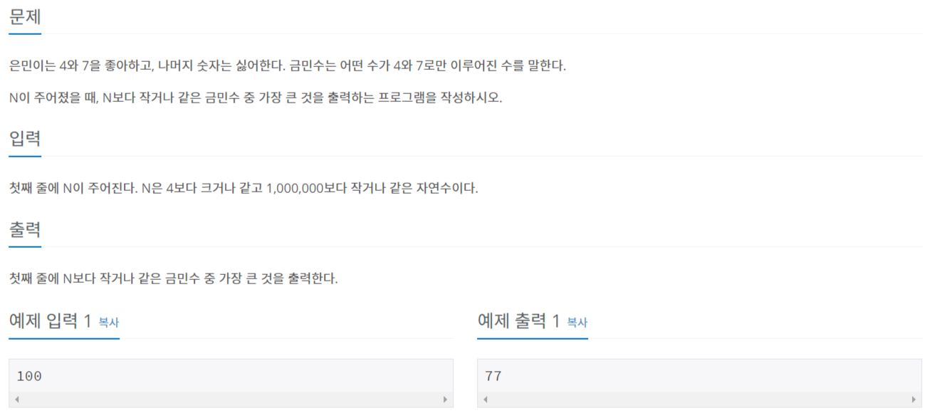 입력값보다 작거나 큰 금민수 중에서 가장 큰 수를 구해야 하기 때문에 입력값에서부터 -1씩 해주면서 검사한다.