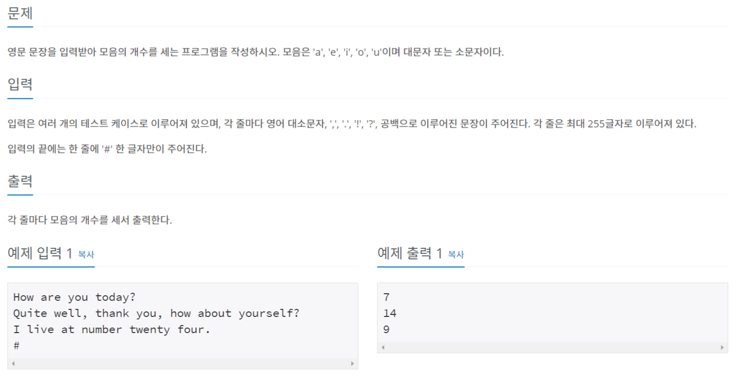 차례대로 sentence가 모음으로 초기화해놓은 vowels 리스트에 있는지 검사 후 있으면 cnt 1 증가