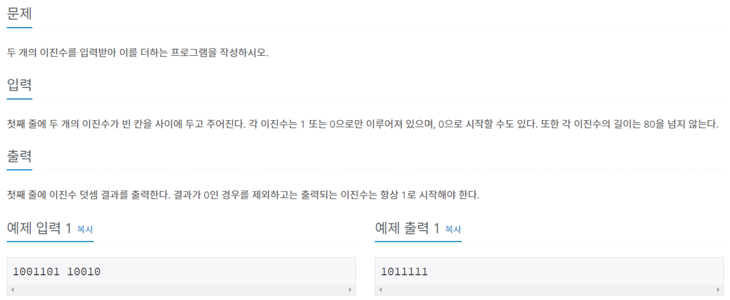 첫째 줄에 두 개의 이진수가 빈 칸을 사이에 두고 주어진다. 각 이진수는 1 또는 0으로만 이루어져 있으며, 0으로 시작할 수도 있다. 또한 각 이진수의 길이는 80을 넘지 않는다.