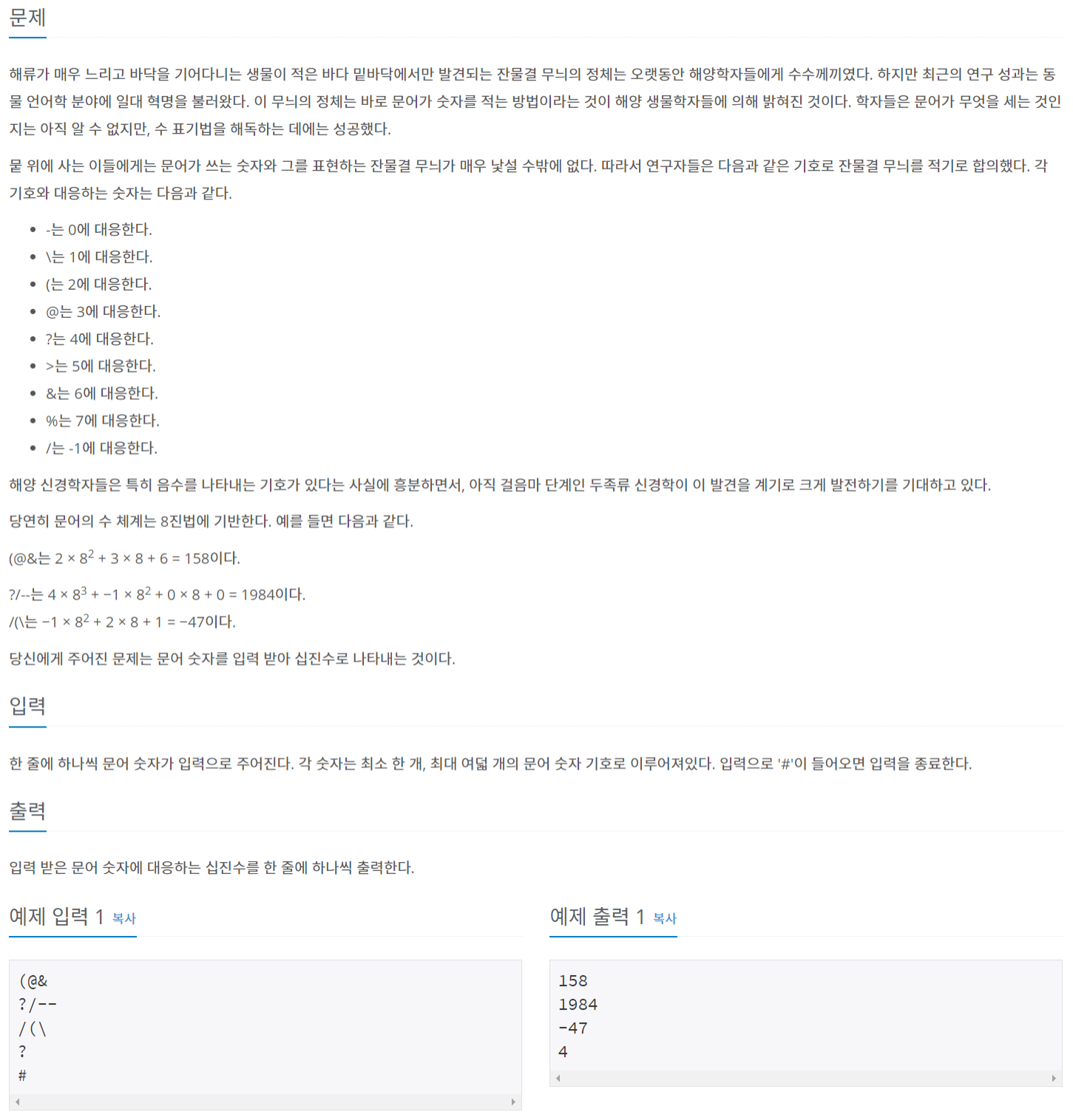 문어 숫자 중 '/'가 -1이라 int( , 8)의 방식으로는 풀 수 없다. 따라서 함수를 사용하지 않고 실제로 8진수를 구하듯이 자릿수마다 8을 곱해주어야 한다.