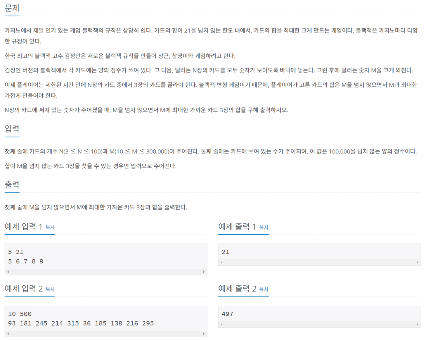 첫째 줄에 카드의 개수 N(3 ≤ N ≤ 100)과 M(10 ≤ M ≤ 300,000)이 주어진다. 둘째 줄에는 카드에 쓰여 있는 수가 주어지며, 이 값은 100,000을 넘지 않는 양의 정수이다. 합이 M을 넘지 않는 카드 3장
